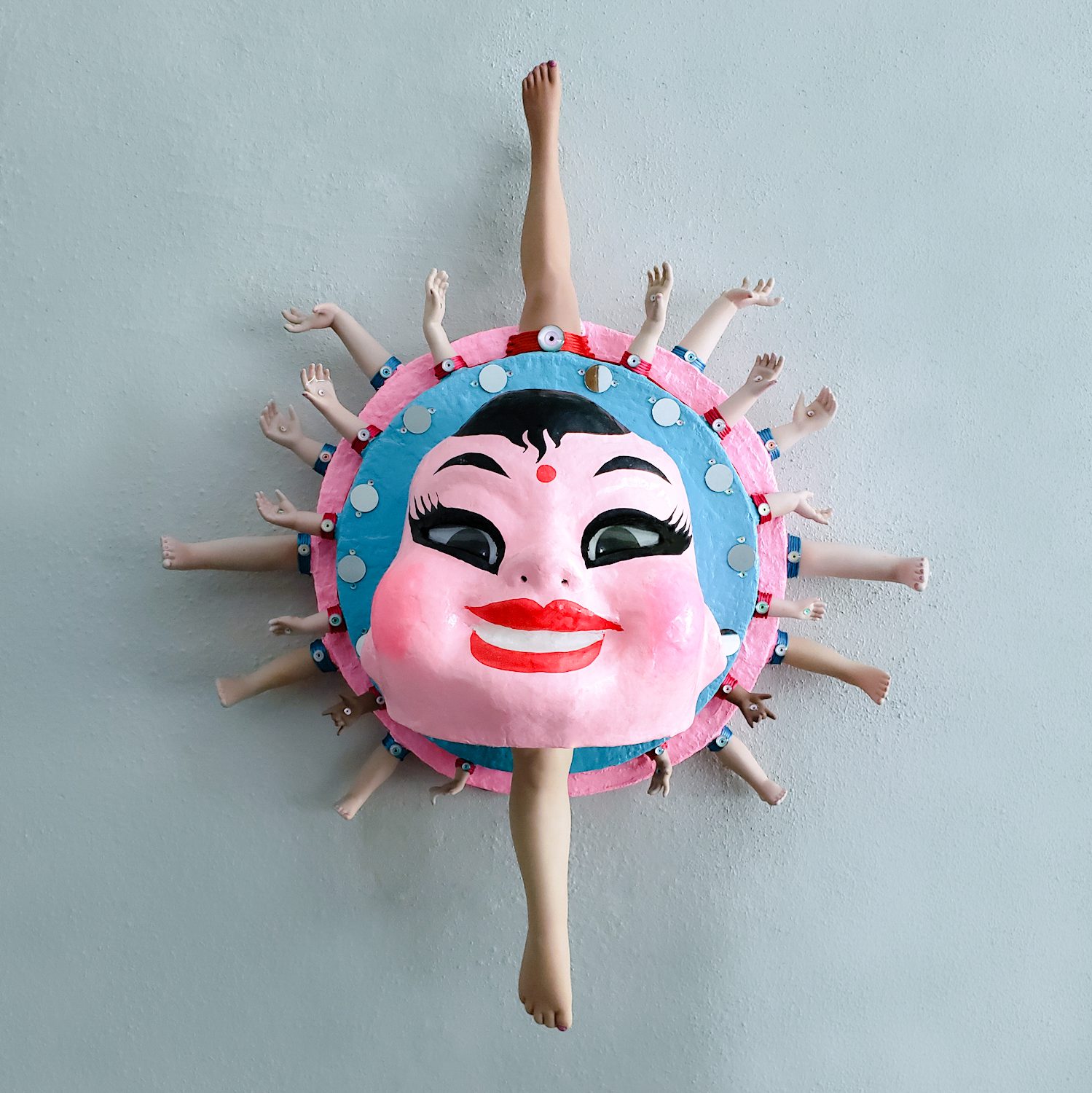 Mandala, 2023. Mixed media: porcelain doll limbs, papier maché mask, googly eyes, glass cabochon doll eyes, silk threads, plaster gauze, mirrors, polystyrene, wood dowels, expanding foam. 34 x 29 x 20 inches. Photo courtesy RL Gibson, The Ford Studios.