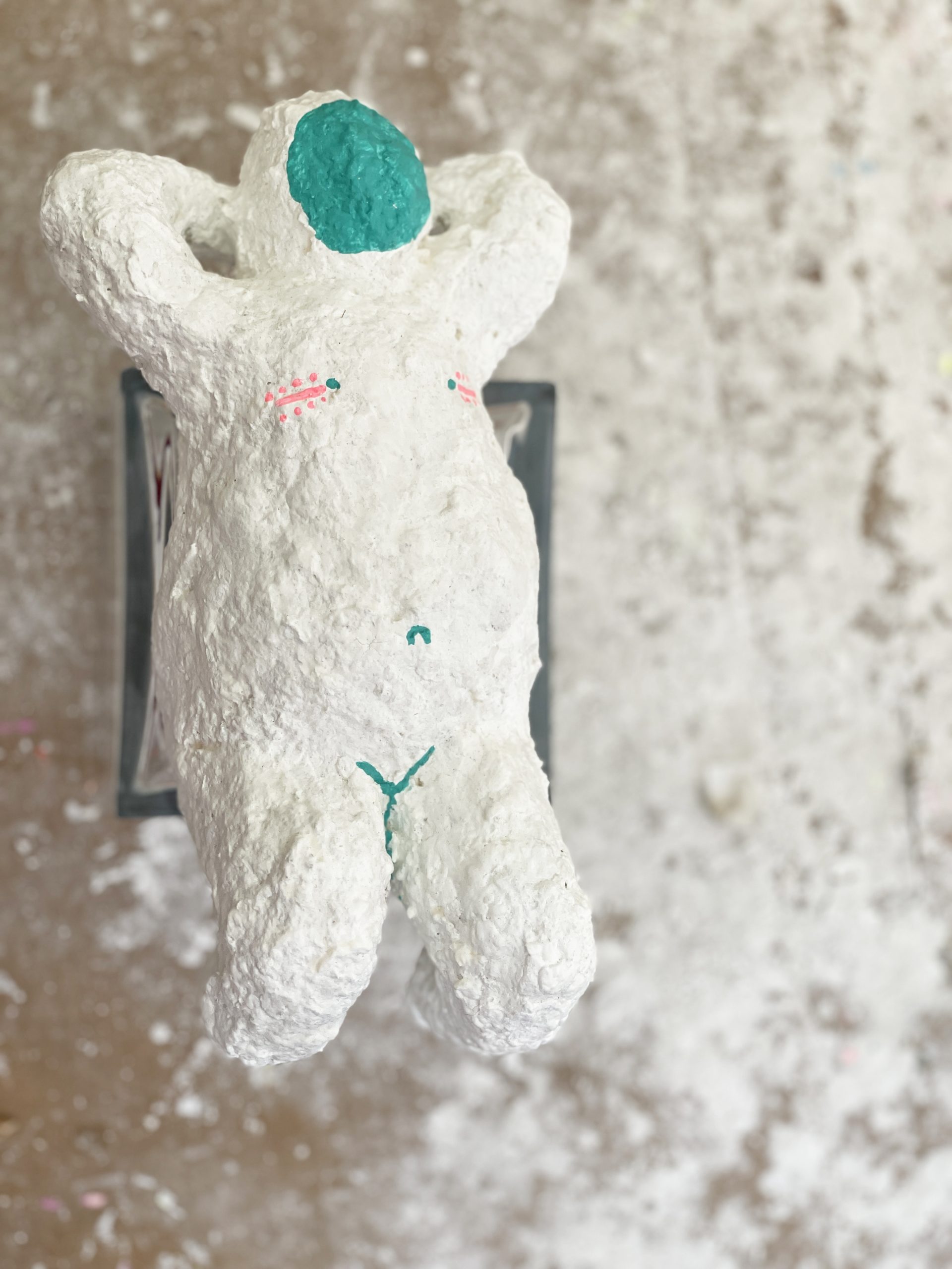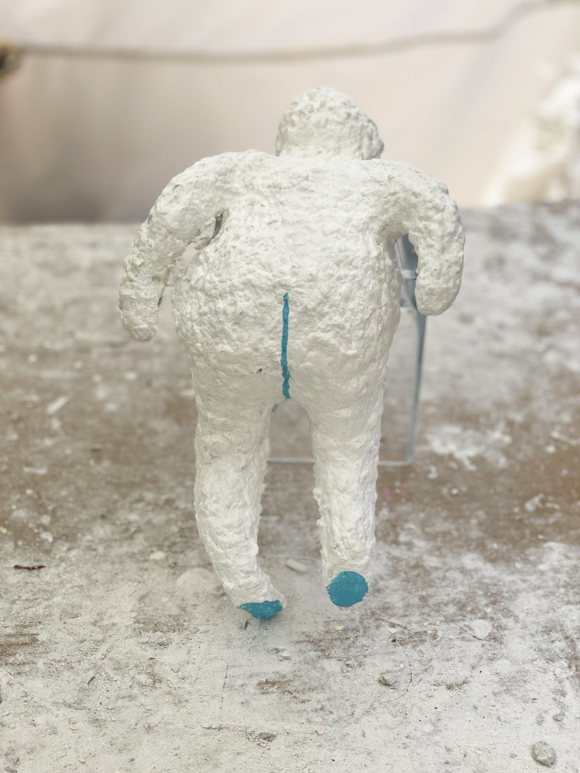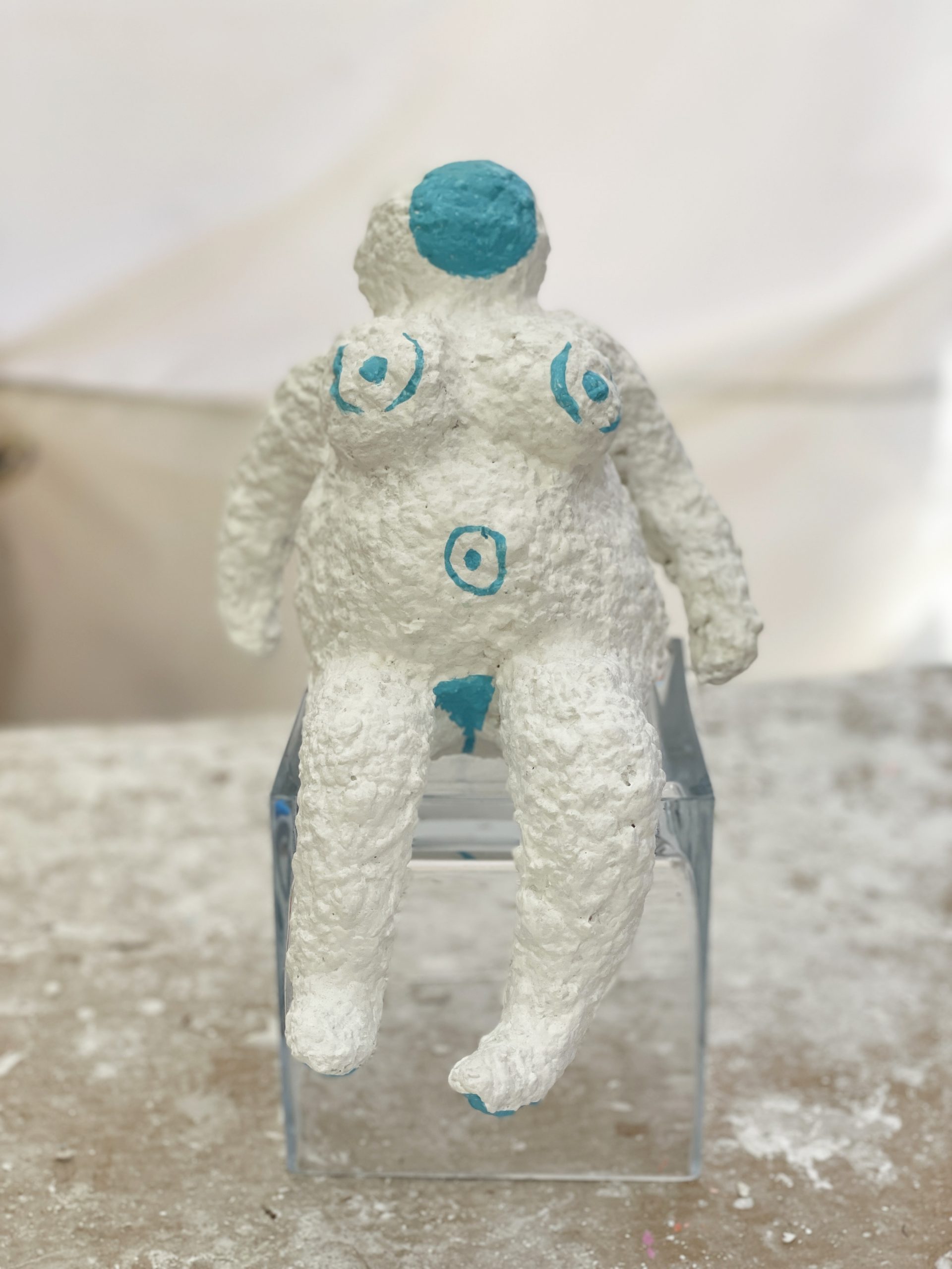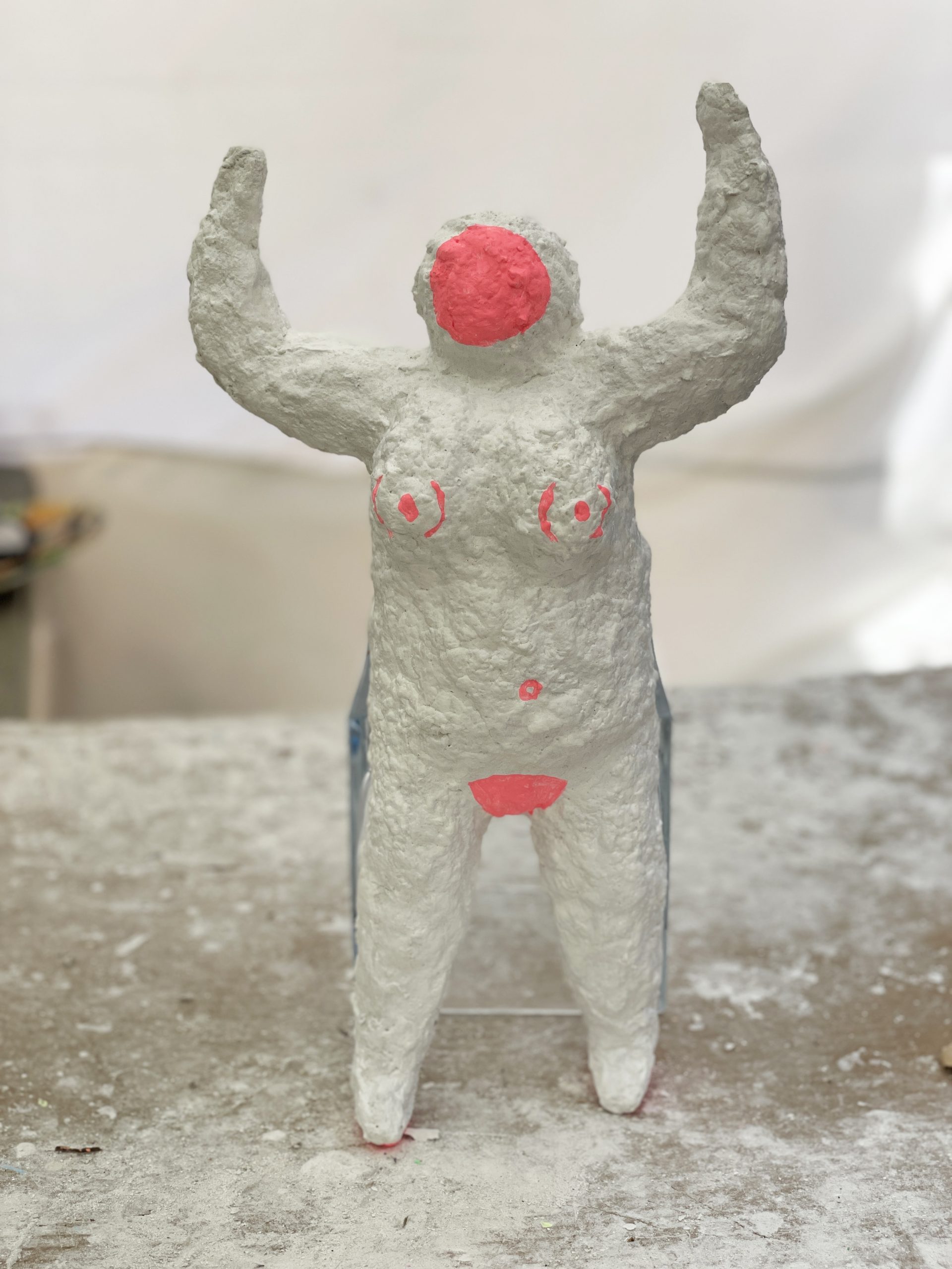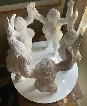 Circle Of Hags, 2024. Mixed media sculpture: armature wire, aluminum foil, plaster gauze wrap, celluclay, gesso, wood disk, acrylic paint. 18x 18 x 15 inches