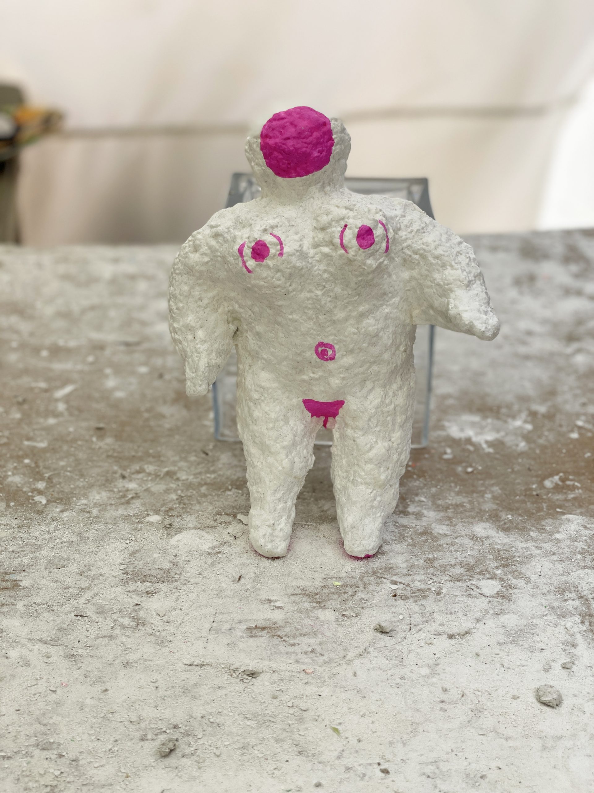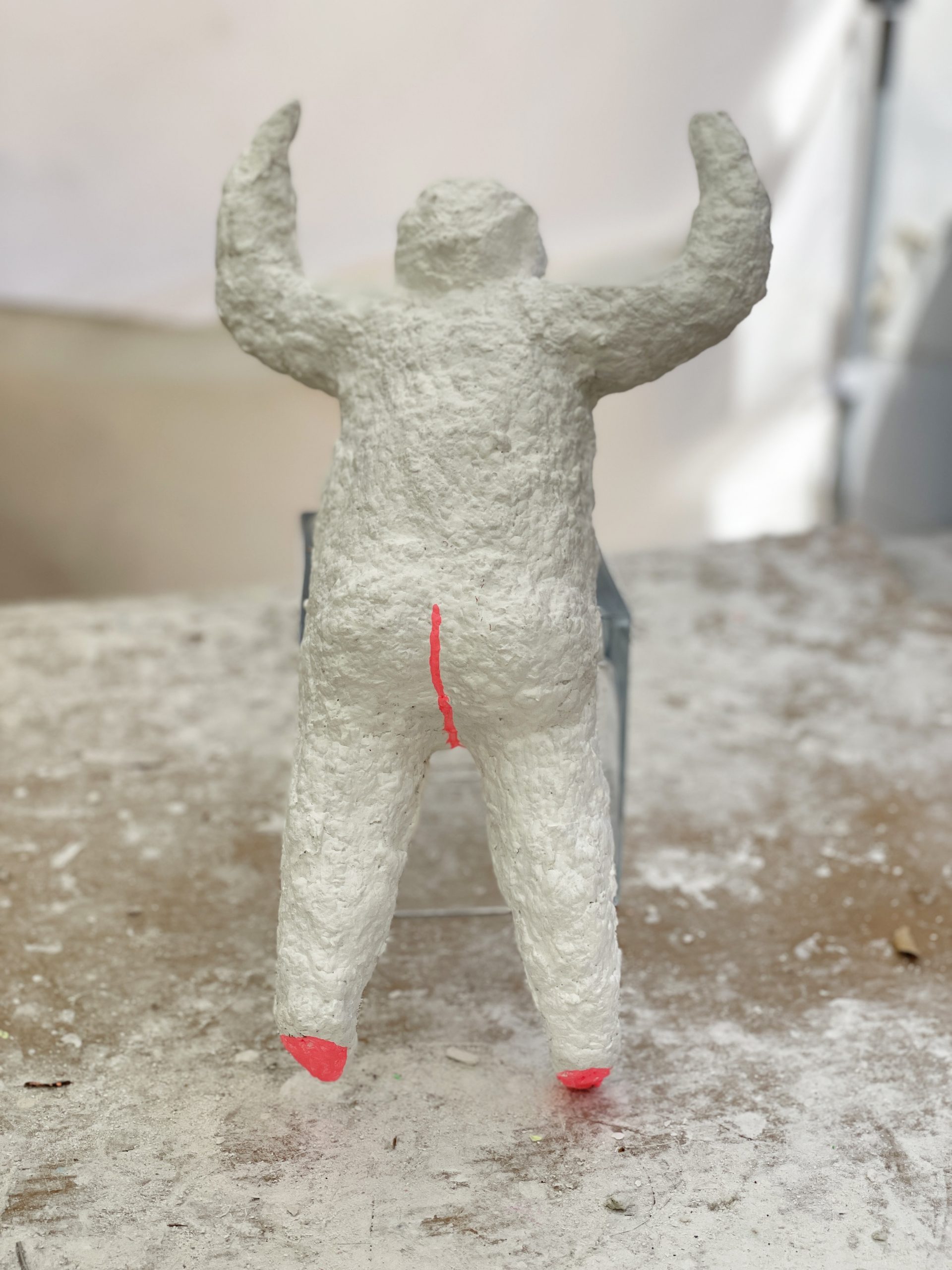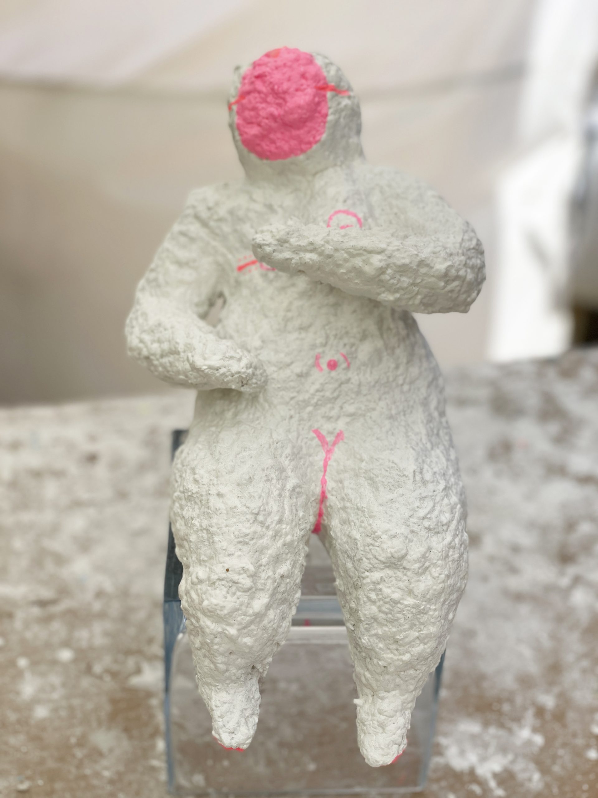 Circle Of Hags, 2024. Mixed media sculpture: armature wire, aluminum foil, plaster gauze wrap, celluclay, gesso, wood disk, acrylic paint. 18x 18 x 15 inches