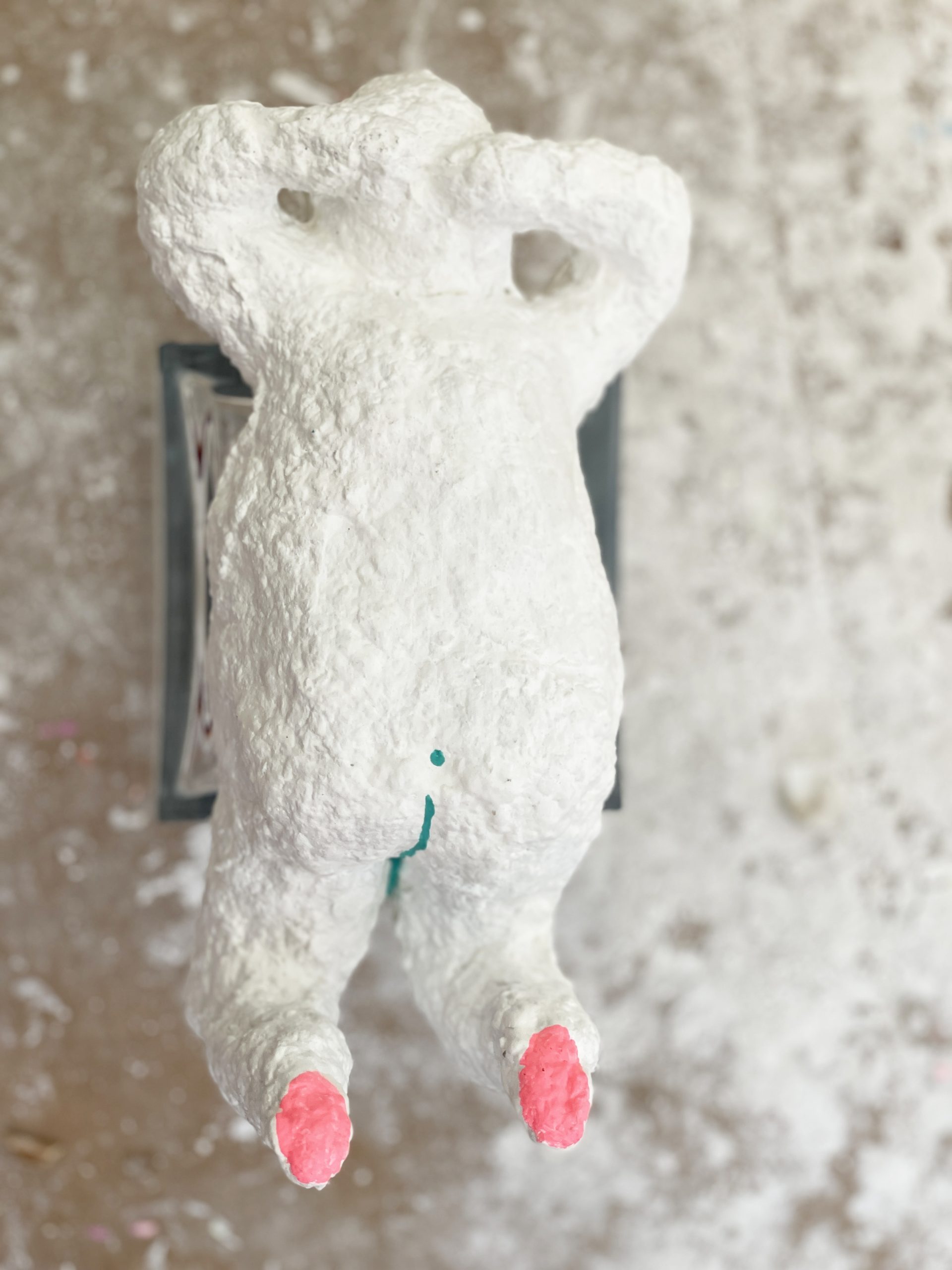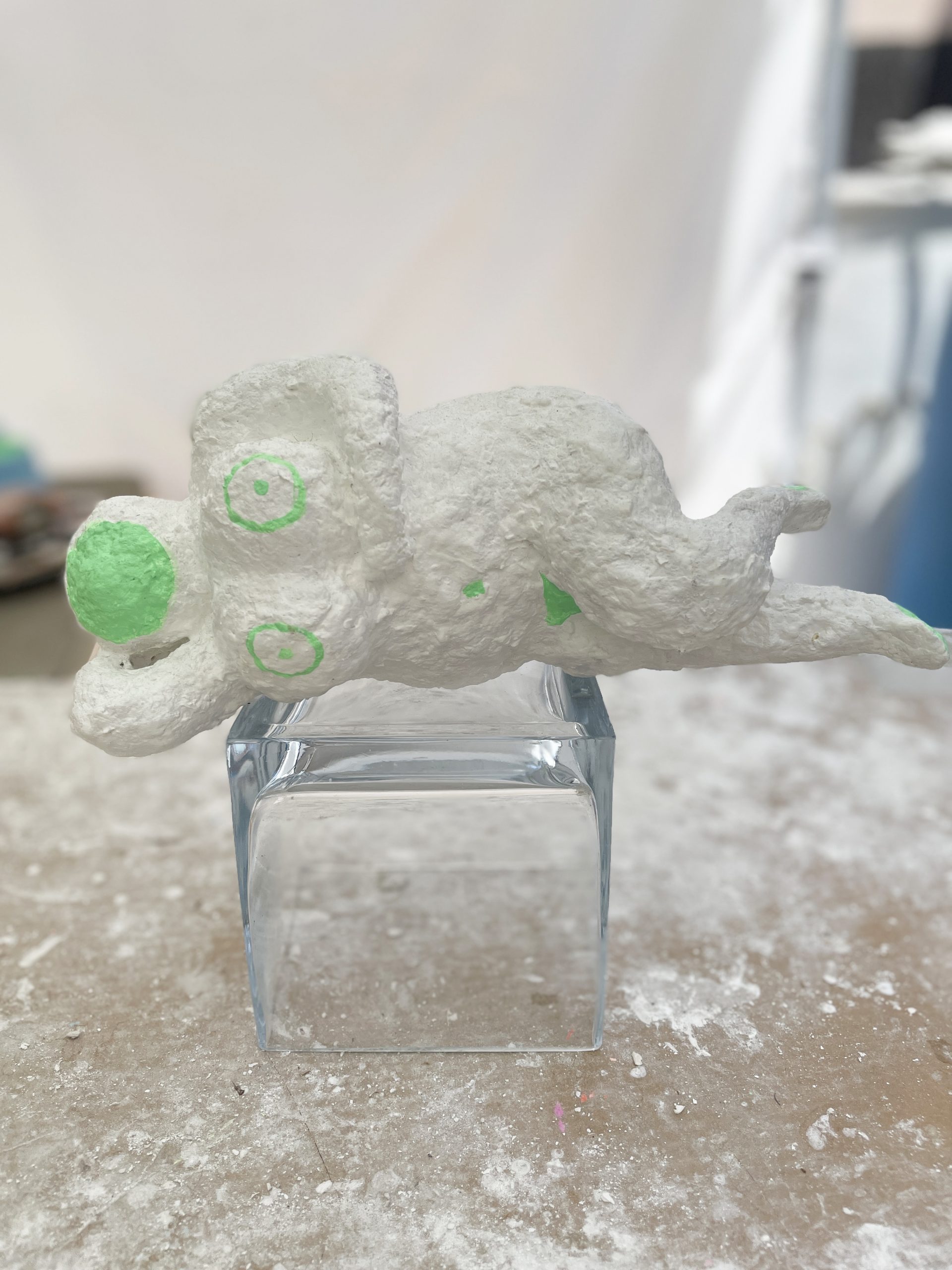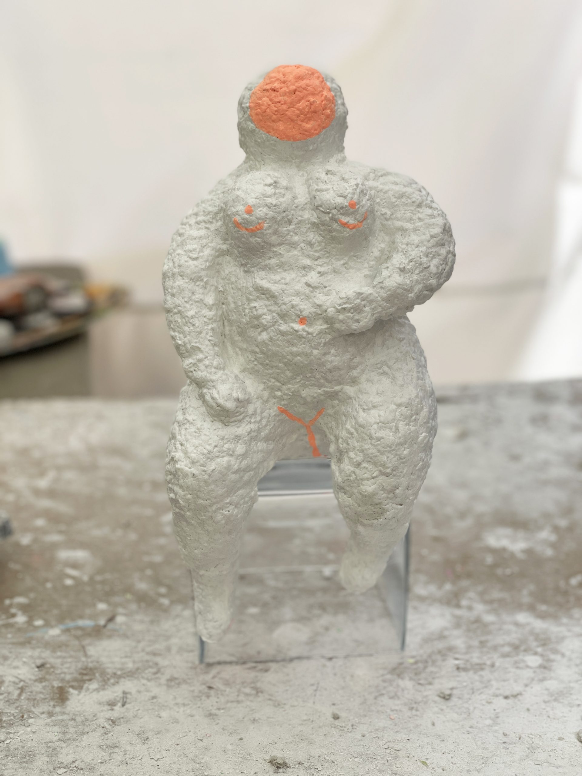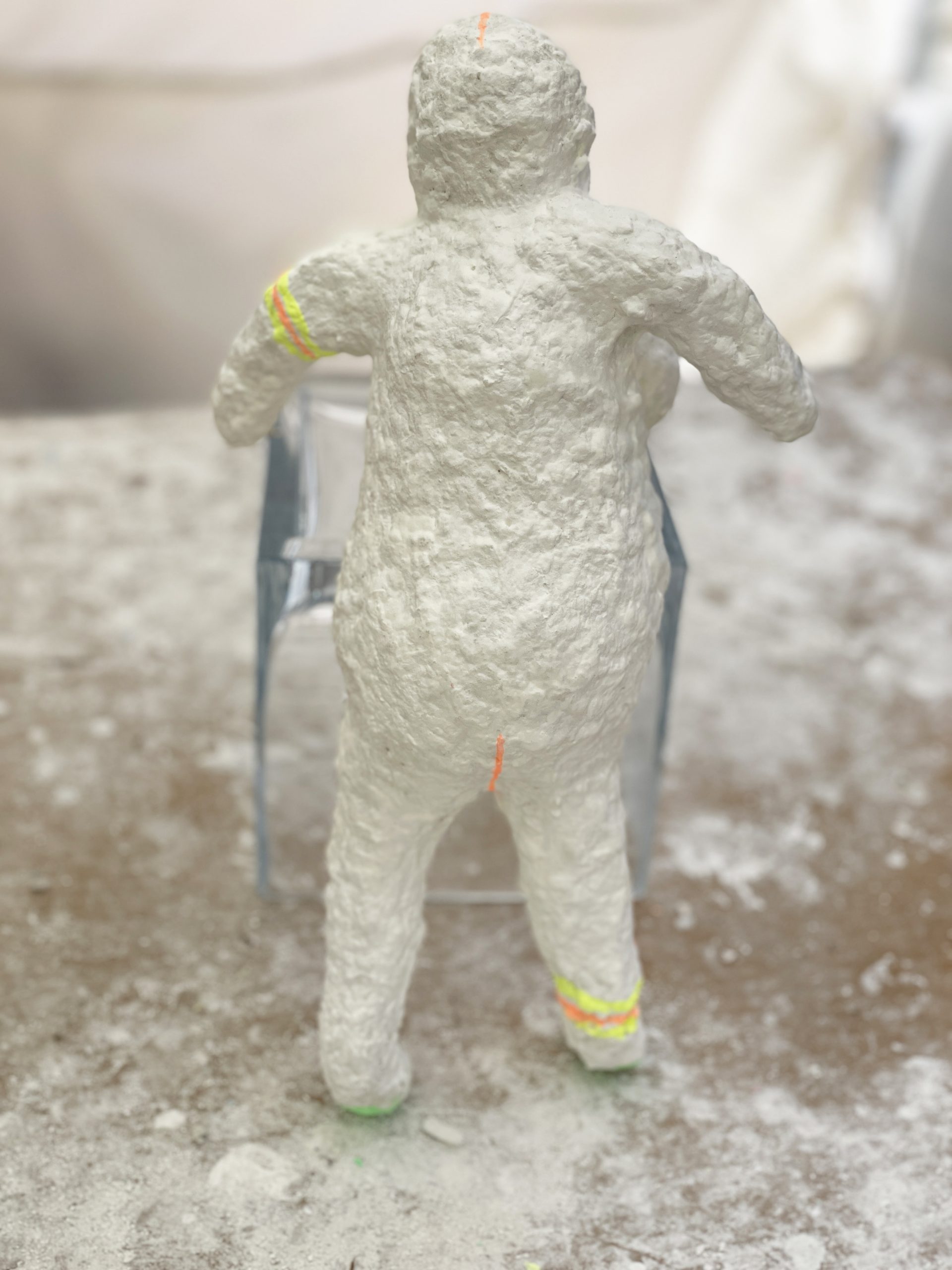 Circle Of Hags, 2024. Mixed media sculpture: armature wire, aluminum foil, plaster gauze wrap, celluclay, gesso, wood disk, acrylic paint. 18x 18 x 15 inches